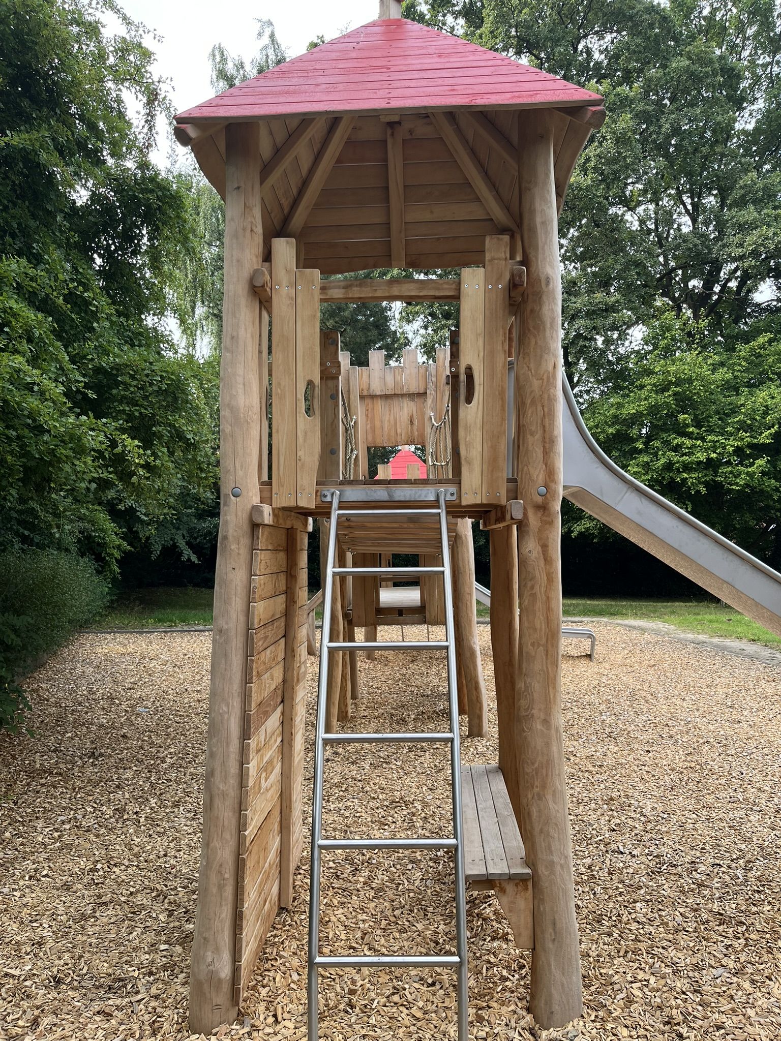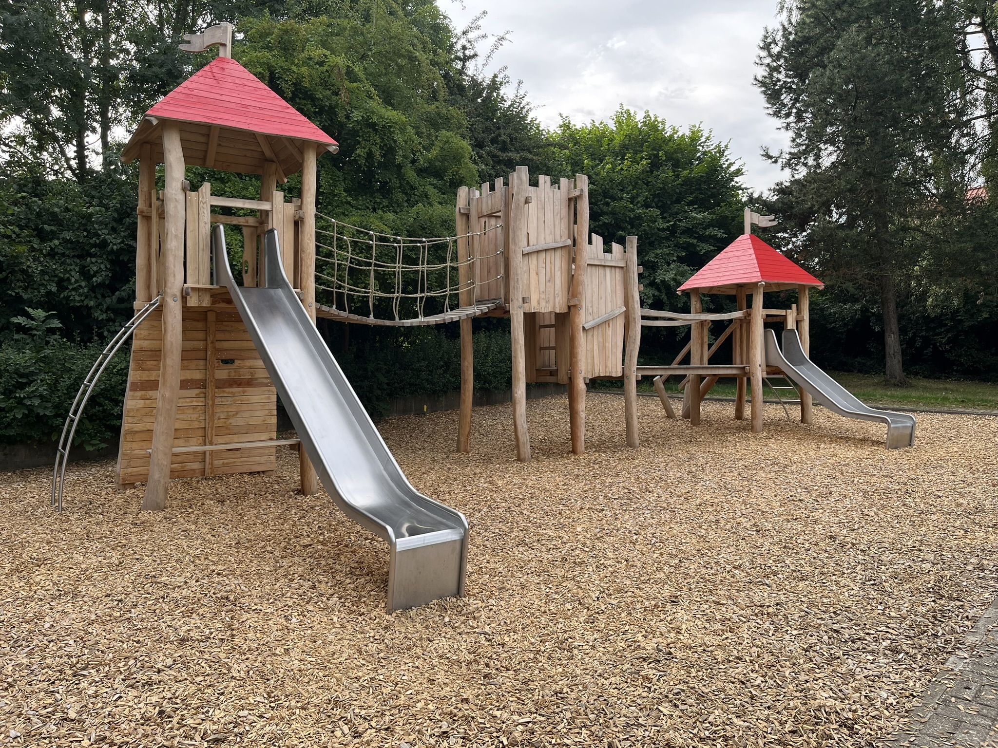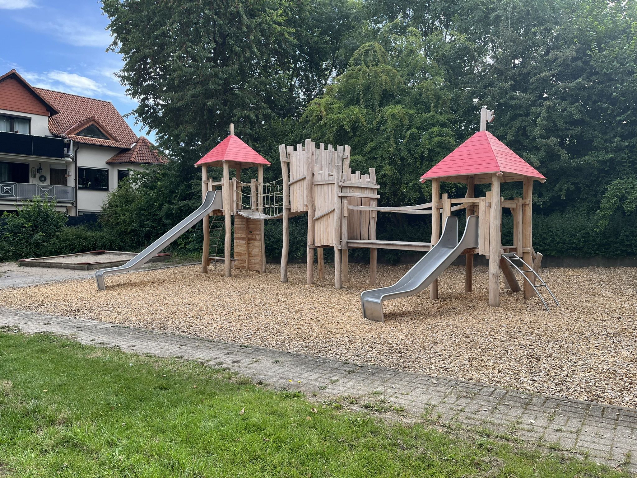 Zentrale Spielkombination mit zwei Rutschen und Klettermöglichkeiten, Sandkasten, Doppelschaukel, Nestschaukel, Federwipptier, Wippe, Pendelsitz-Karussell, Boulebahn