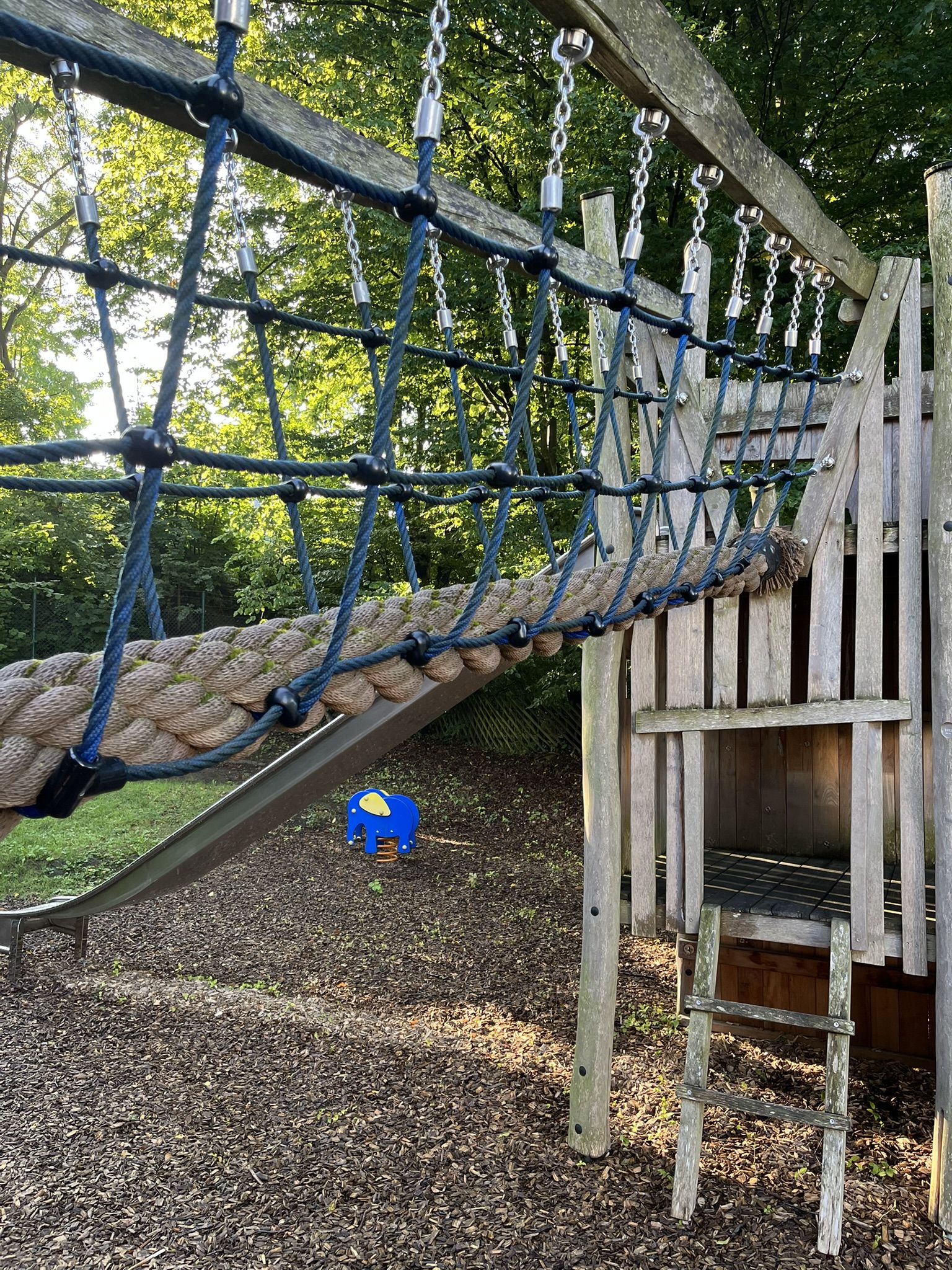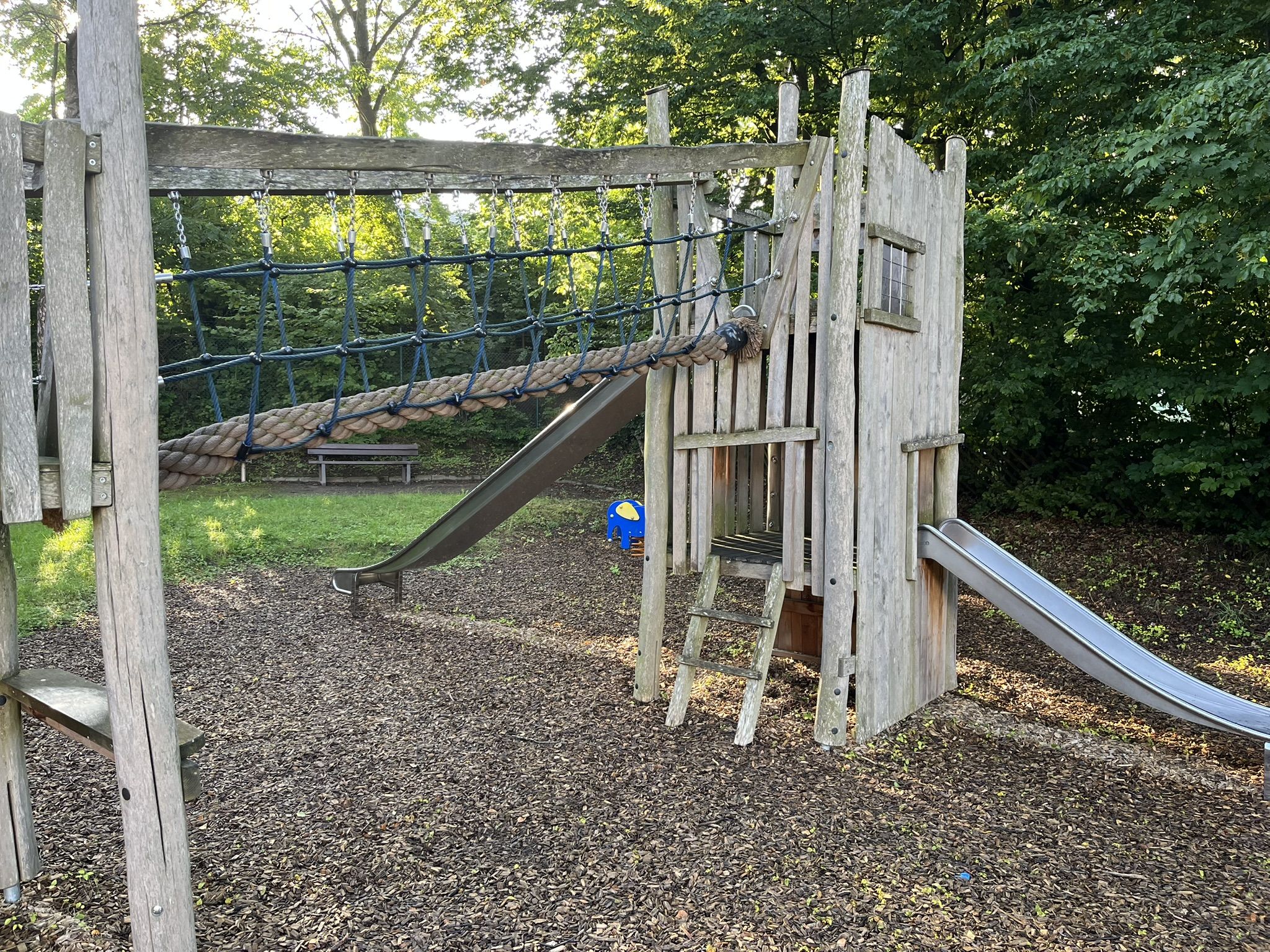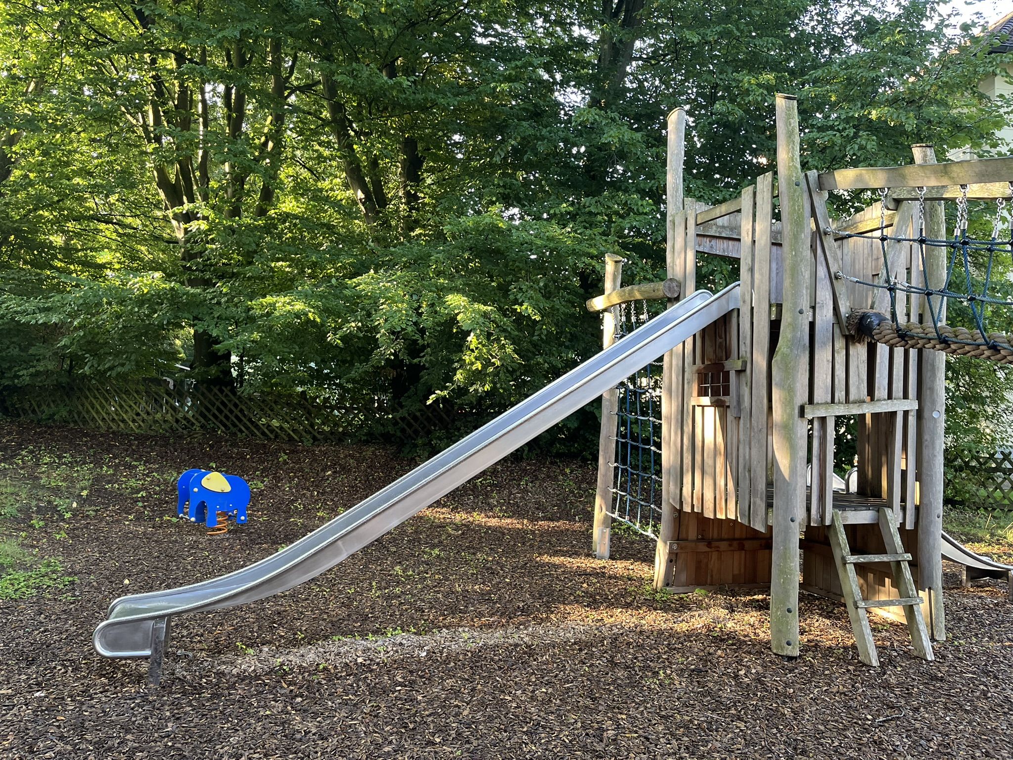 Zentrale Spielkombination mit zwei Rutschen und Klettermöglichkeiten, Federwipptier