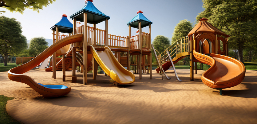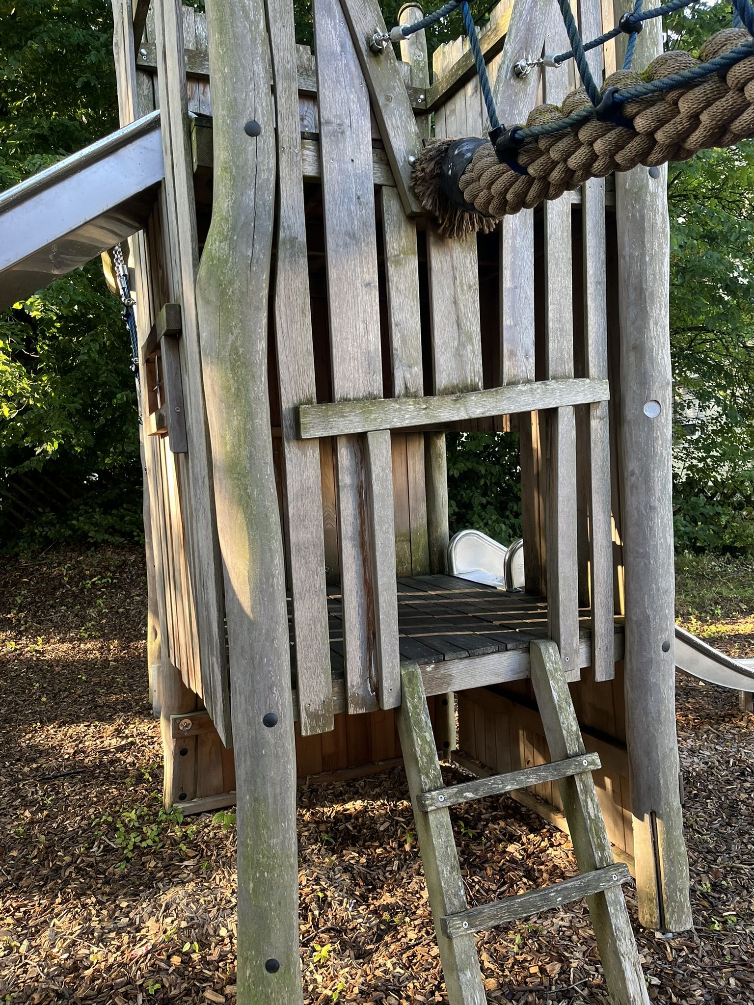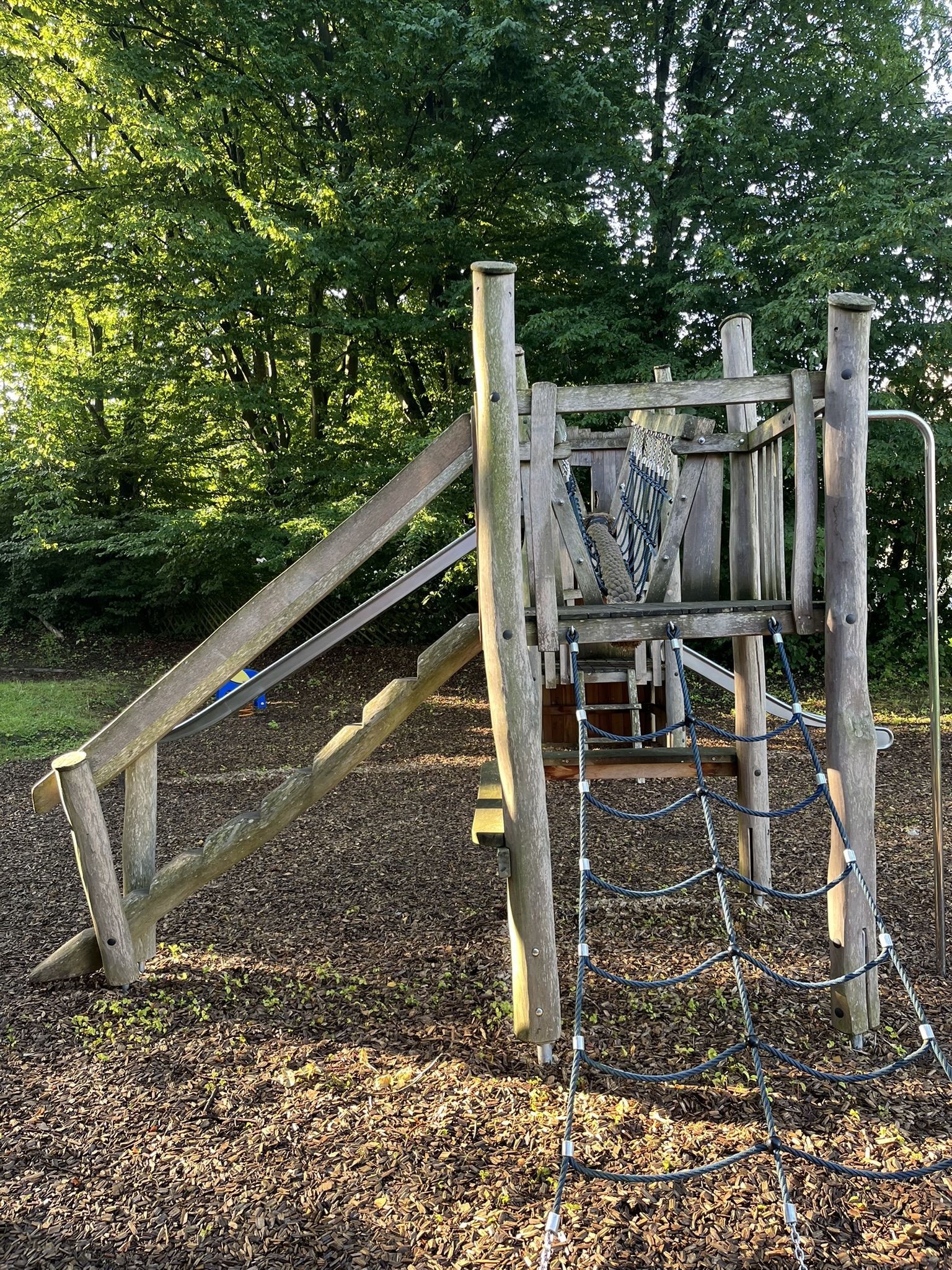 Zentrale Spielkombination mit zwei Rutschen und Klettermöglichkeiten, Federwipptier